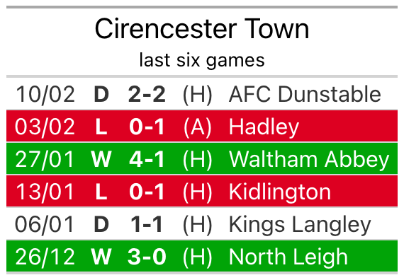 Their last meeting was on September 30, when Cirencester won 2-1 at home.