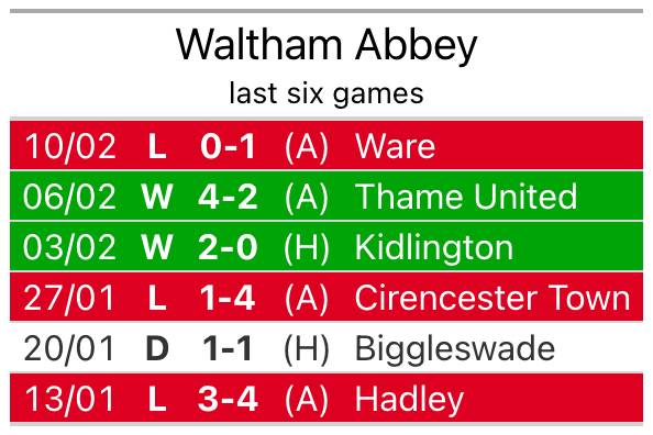 Waltham Abbey, who sit fourth in the league after 26 games, fell to a 1-0 away defeat to Ware on February 10.