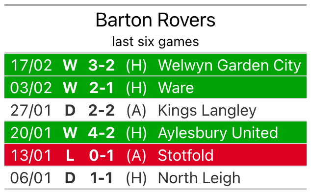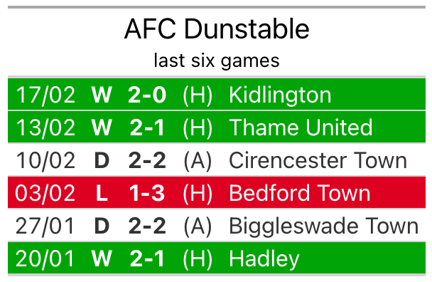 And also with three wins and two draws over that period, Dunstable’s form is identical – they have both taken 11 points from 18.