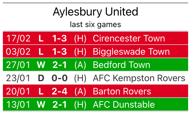 Aylesbury are 17th in the table after 25 games, of which they have won seven and drawn four, earning 25 points.