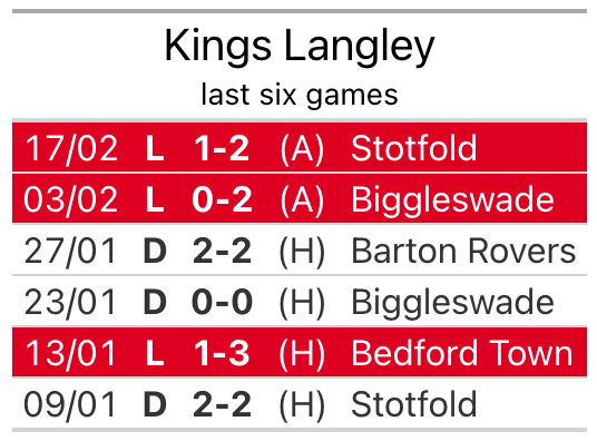 They face a Kings Langley side who also lost their last match, a 2-1 defeat to Stotfold, and who sit ninth in the table.