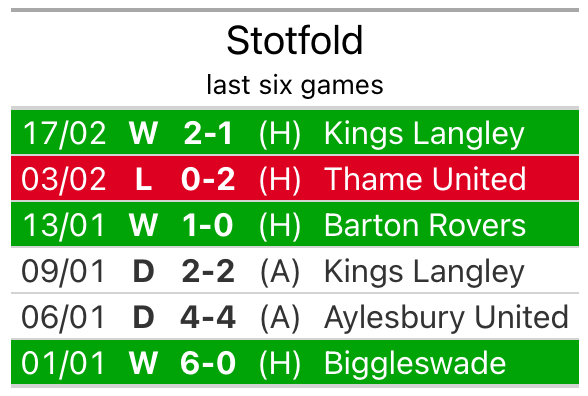 In their last league match, on February 17, Stotfold beat Kings Langley 2-1 at home.