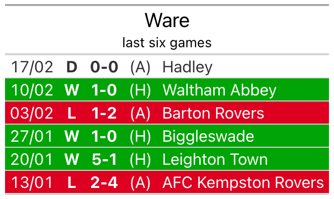 With three wins and a draw over that period, Ware’s form is slightly worse – they have taken 10 points from 18, compared to Stotfold’s 11.