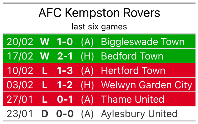 Their last meeting was on February 17, when Kempston Rovers won 2-1 at home.
