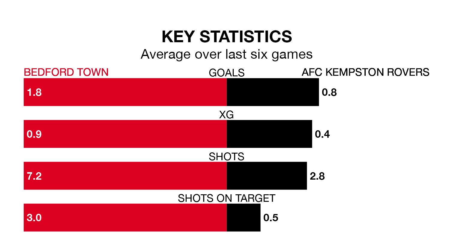 Bedford, meanwhile, are above average scorers, with 2.0 goals per game, compared to a league average of 1.7. They have conceded 0.9 goals per game.