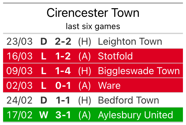 Their last meeting was on September 16, when Cirencester won 4-0 at home.