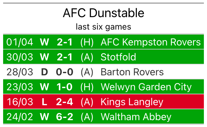 Dunstable, meanwhile, are above average scorers, with 2.0 goals per game, compared to a league average of 1.7. They have conceded 1.8 goals per game.