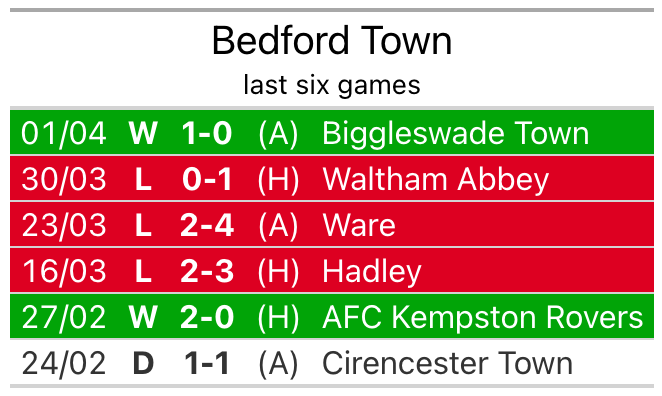Bedford’s last match was on April 1, a 1-0 win against Biggleswade Town.