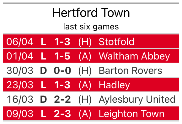 Hertford lost 3-1 against Stotfold last time out, on April 6.
