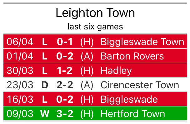 Leighton lost 1-0 against Biggleswade Town last time out, also on April 6.