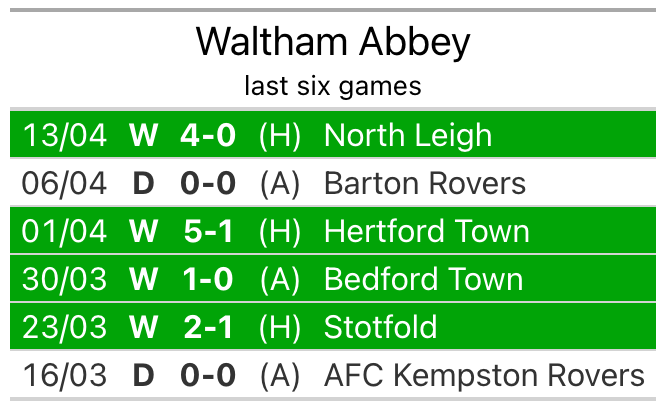 They travel to play a Waltham Abbey side fourth in the standings, who also won their last match, 4-0 against North Leigh, on April 13.