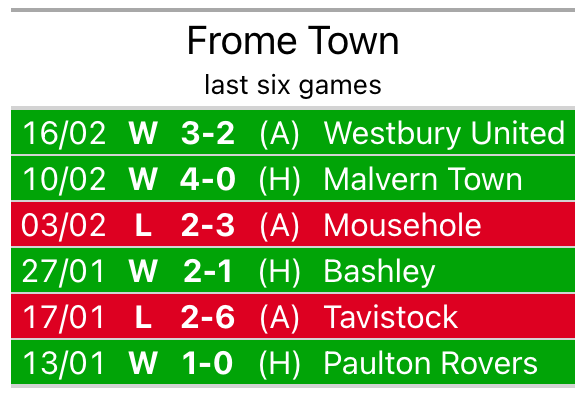 In their last league match, on February 16, Frome beat Westbury United 3-2 away.