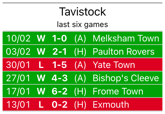 Tavistock also won, 1-0 away at Melksham Town on February 10.
