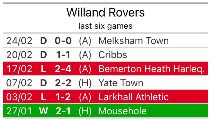 Willand have lost two and drawn three matches since they last earned three points – against Mousehole on January 27.