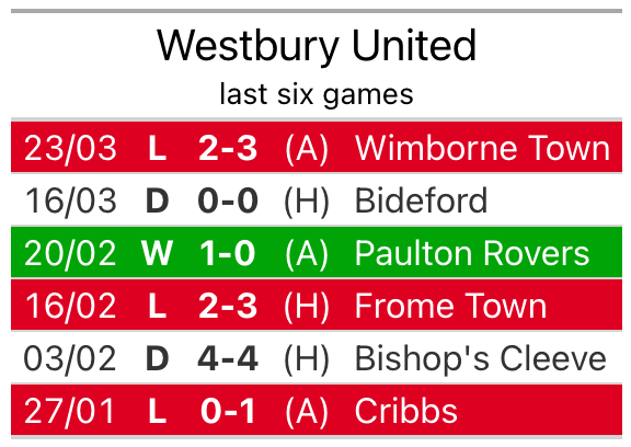 In their last league match, on Saturday, Westbury lost to Wimborne Town 3-2 away.