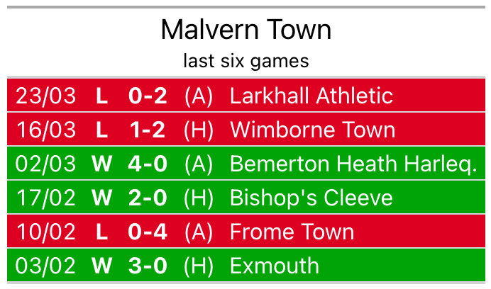 In their last league match, on Saturday, Malvern lost to Larkhall Athletic 2-0 away.