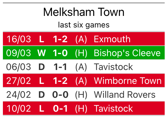 Melksham also lost, 2-1 away at Exmouth on March 16.