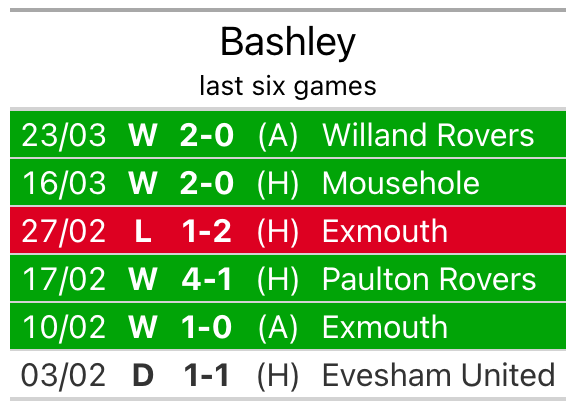 In their last league match, on March 23, Bashley beat Willand Rovers 2-0 away.
