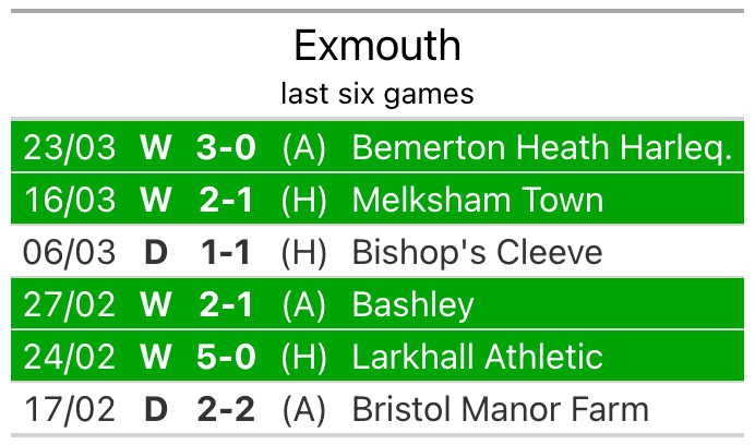 Exmouth are in good form in the Southern League Division One South, with four wins and two draws from their last six games.