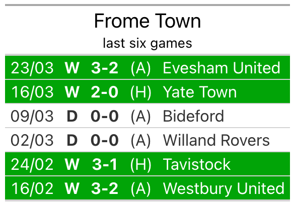 Frome’s last match was on March 23, a 3-2 win against Evesham United.