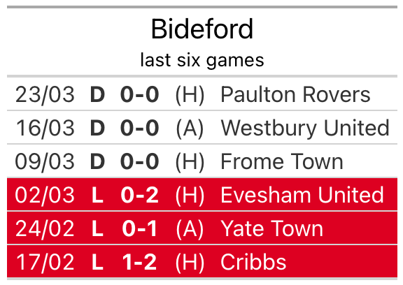Bideford drew 0-0 with Paulton Rovers last time out, also on March 23.
