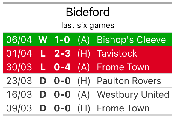 In their last league match, on April 6, Bideford beat Bishop’s Cleeve 1-0 away.