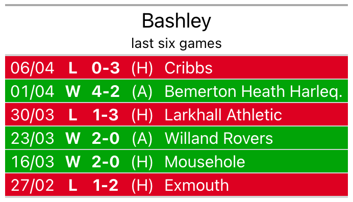 Bashley are also below average scorers, with 1.3 goals per game, compared to a league average of 1.6. They have conceded 1.7 goals per game.
