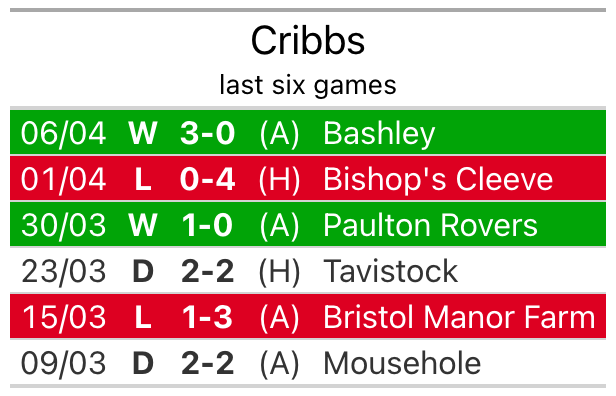 Cribbs’s last match was on April 6, a 3-0 win against Bashley.