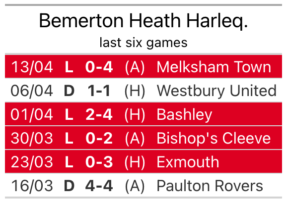 Bemerton Heath Harleq.’s last match was on April 13, a 4-0 loss against Melksham Town.