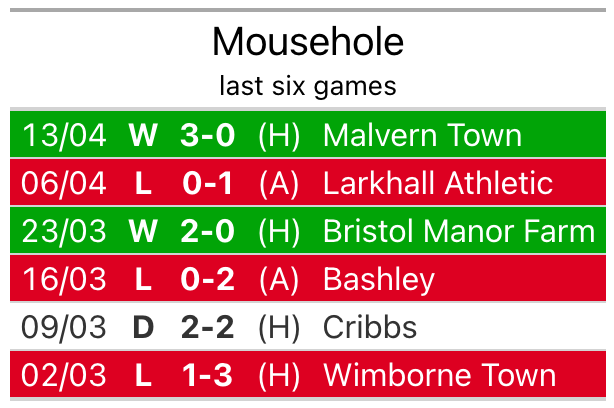 Mousehole beat Malvern Town 3-0 last time out, also on April 13.
