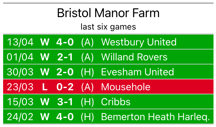 Bristol Manor Farm’s last match was on April 13, a 4-0 win against Westbury United.