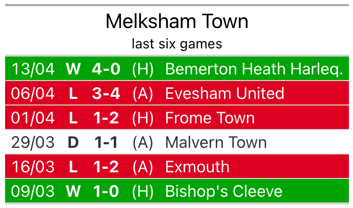 Melksham beat Bemerton Heath Harleq. 4-0 last time out, also on April 13.
