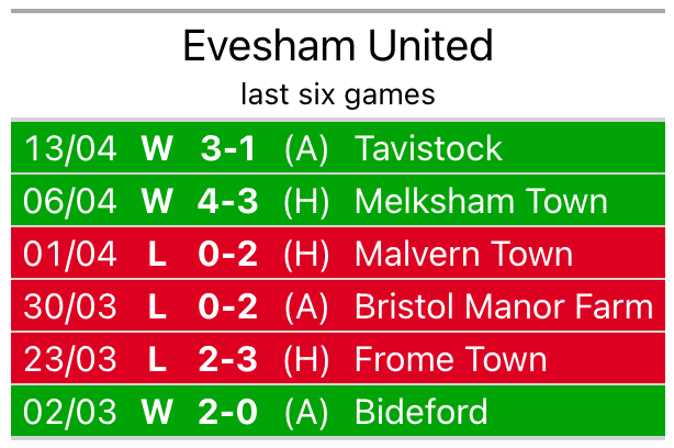 Evesham’s last match was on April 13, a 3-1 win against Tavistock.