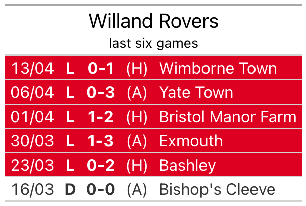 Willand lost 1-0 against Wimborne Town last time out, also on April 13.