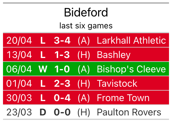 Bideford’s last match was on April 20, a 4-3 loss against Larkhall Athletic.