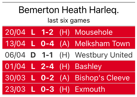 Bideford have won one and drawn one of the last six, while Bemerton Heath Harleq. have taken just one draw.