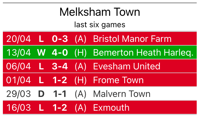 Melksham’s last match was on April 20, a 3-0 loss against Bristol Manor Farm.