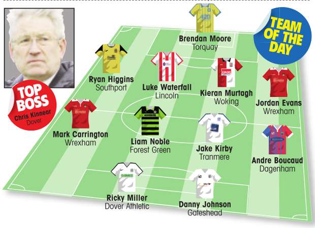 Jake Kirby also grabbed two for Tranmere and he was joined in midfield by Dagenham man of the match Andre Boucaud, Liam Noble of Forest Green and Wrexham’s Mark Carrington.