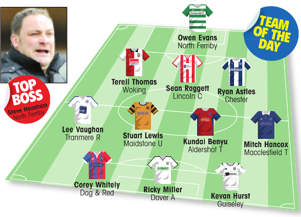Chester’s Ryan Astles and Sean Raggett of Lincoln, regulars in the Team of the Day this season, featured again in defence and they were joined by Terell Thomas of Woking.