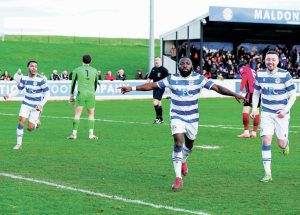 By Lee Witney FLYING: Terrell Egbi celebrates one of his double strike for Maldon & Tiptree PICTURE: Olly Martinez DIV 1...