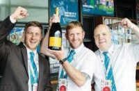 By Hugo Varley LOVELY BUBBLY! Barnoldswick Town trio, L-R, Matt Barnes, Stewart Airdrie and Steve Brown celebrate WEYMOUTH and Barnoldswick Town...