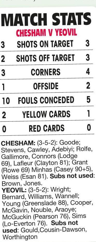 By Simon Newbury CHESHAM UTD 1 Cawley 90+2 YEOVIL TOWN 0 JACK Cawley’s stoppage-time header ensured Chesham United pulled off one...
