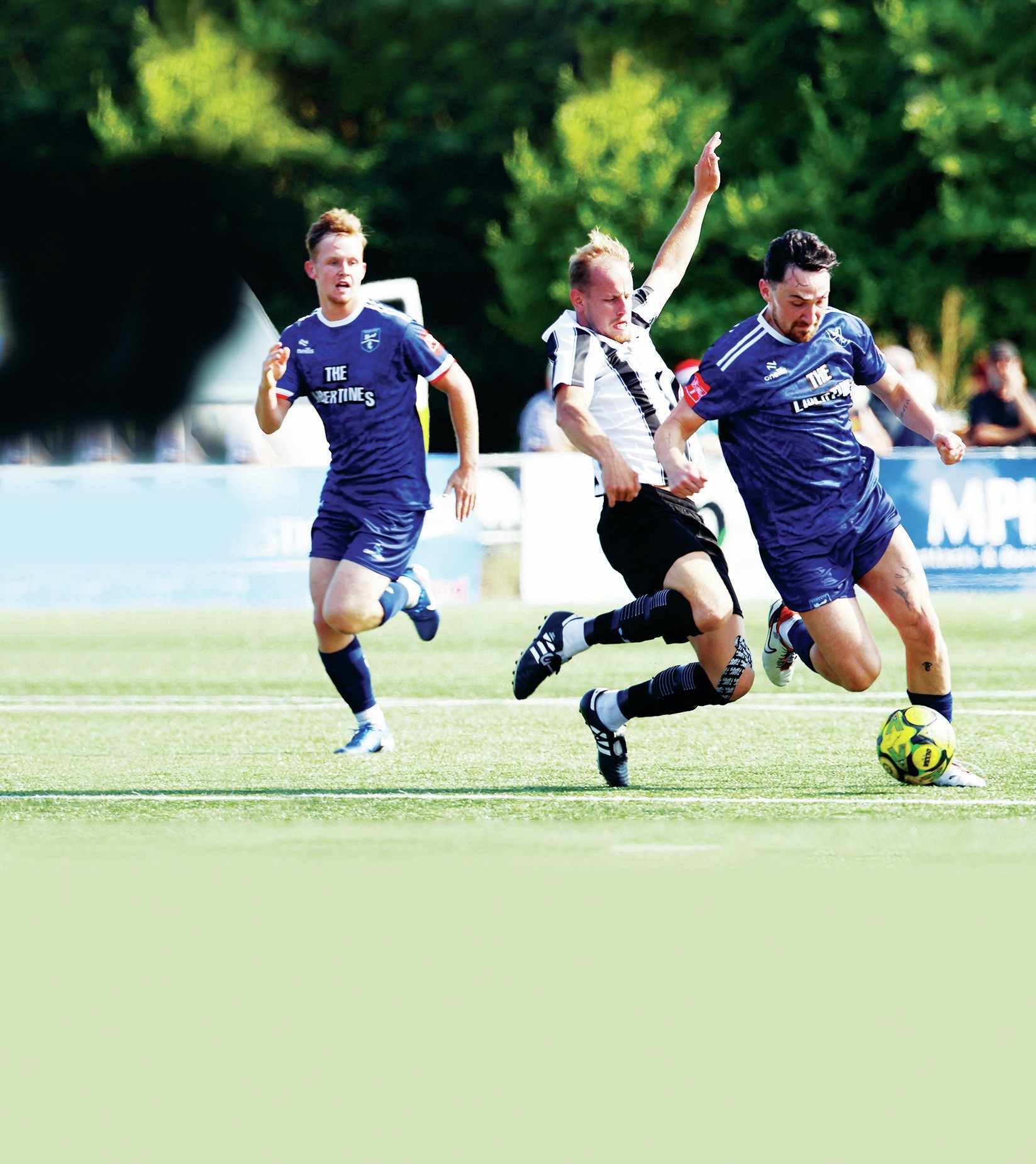 STEP 4 HOSTS By Dave Lawrence SLIDING IN: Loxwood’s Alfie Jones, left, challenges Lukas Franzen-Jones and, inset, Ben Greenhalgh scores from...