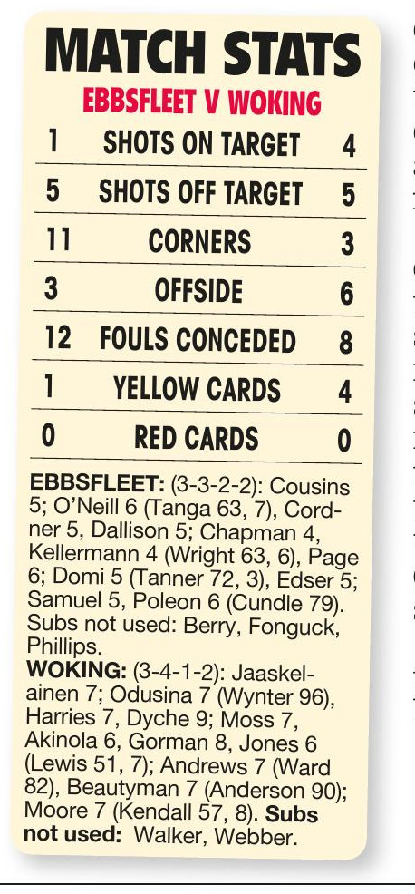 By Mitul Samji WOKING 1 Beautyman 64 (pen) EBBSFLEET UTD 1 Akinola (og) 74 REVITALISED Ebbsfleet United fired a late equaliser...