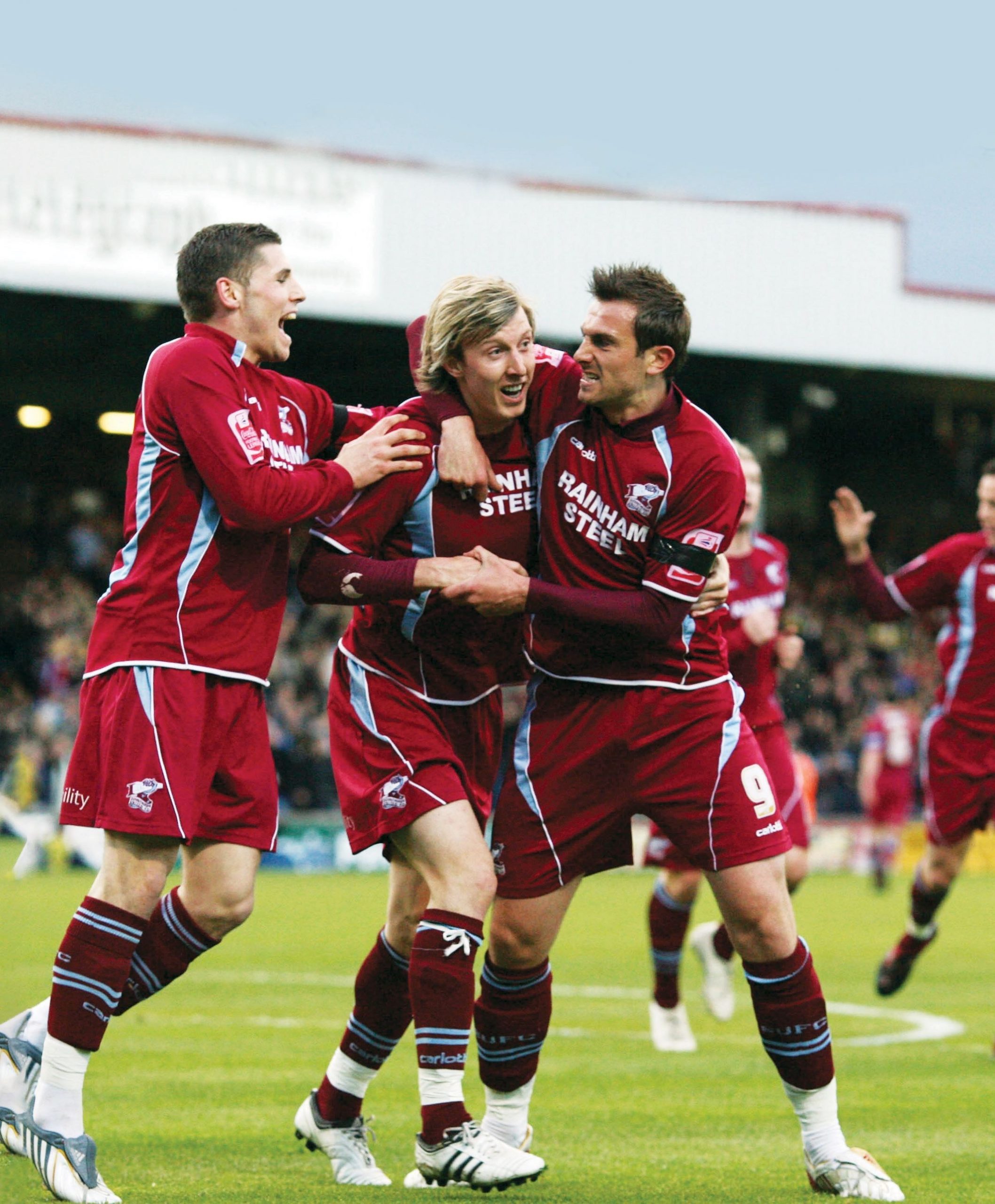 IRON MAN: Martyn Woolford scored in the play-off semi -fi nal for Scunthorpe and, inset, celebrating promotion with the Lincolnshire club...