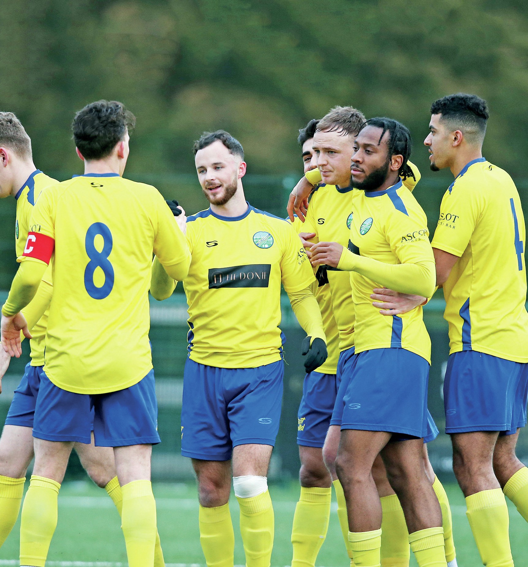 COMBINED COUNTIES By Robin Jones HEARTY MEAL: Marcus Mealing is mobbed by his Ascot United teammates after scoring the first of...