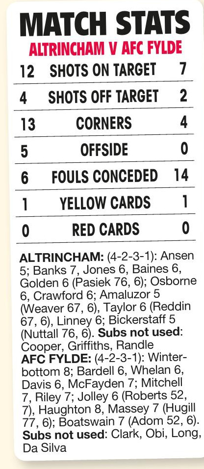 By Andy Marshall ALTRINCHAM 1 Banks 16 AFC FYLDE 2 Massey 7, Haughton 26 MANAGERLESS AFC Fylde shocked play-off chasing Altrincham...