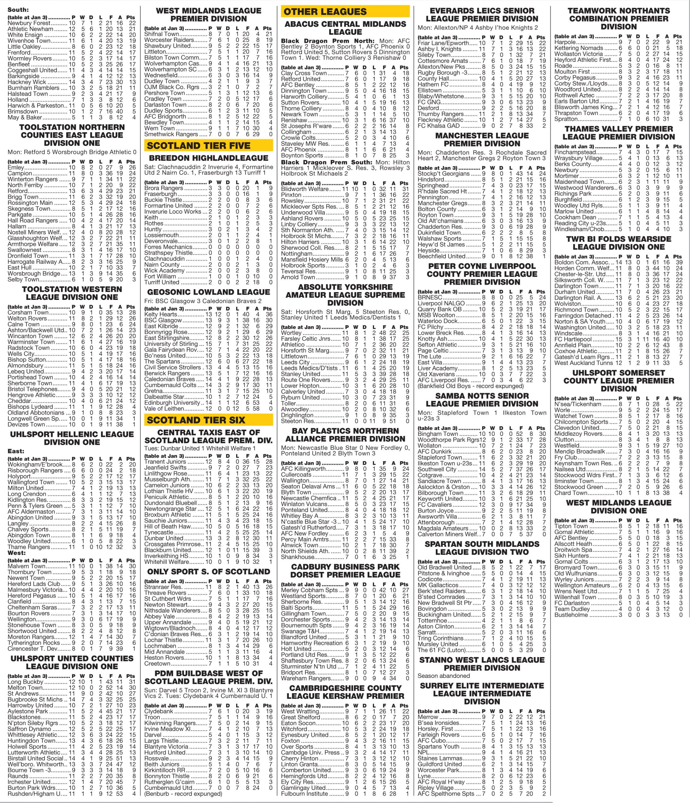 OTHER RESULTS Absolute Yorks Amateur League Div One: Sat: Morley Res. 2 Horsforth SM A 2 Absolute Yorks Amateur League Div...