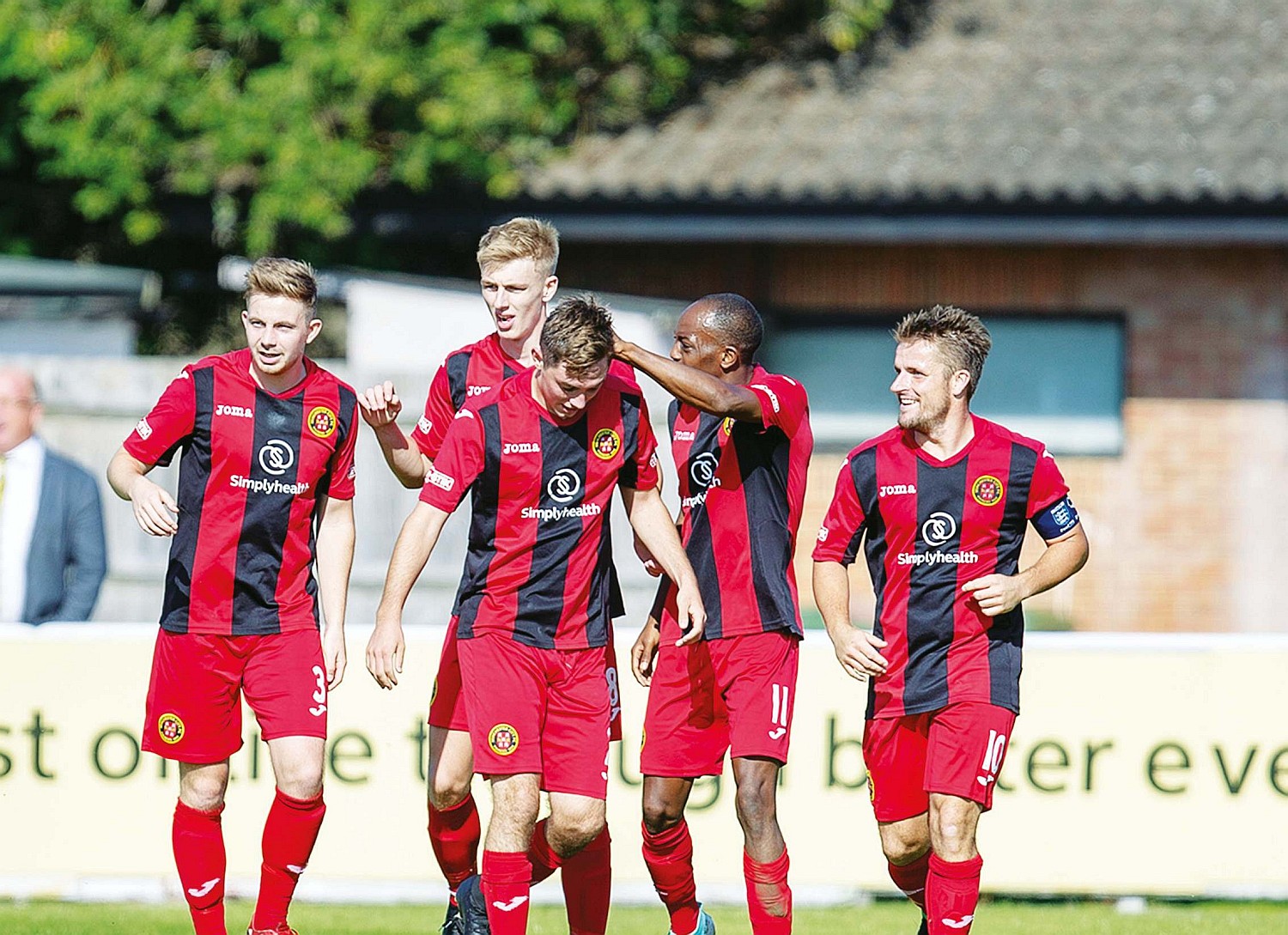 By Gerry Lucas THAT’S HANDY! Elliott Sandy celebrates Corby’s equaliser PICTURE: Mike Capps DIV 1 CENTRAL ELLIOT Sandy’s strike just before...