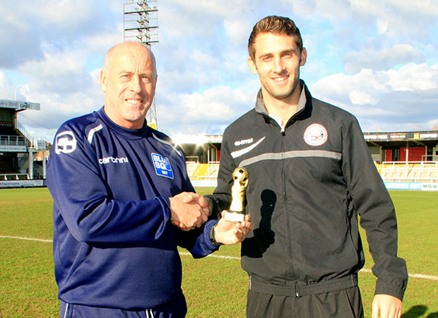 Luke Graham picks up the Hereford United Player of the Month award for December from his manager Martin Foyle
